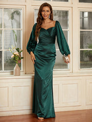 Sheath/Column Silk like Satin Ruched V-neck Long Sleeves Floor-Length Dresses