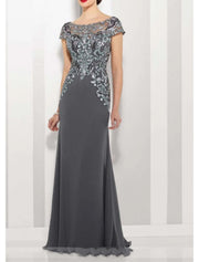 A-Line Mother of the Bride Dress Elegant Jewel Neck Floor Length Chiffon Lace Short Sleeve with Lace Appliques