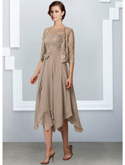 A-Line Mother of the Bride Dress Elegant Jewel Neck Tea Length Chiffon Lace Half Sleeve with Pleats