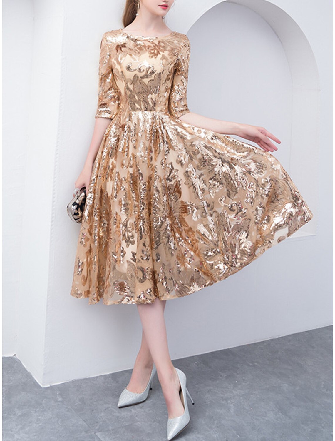 A-Line Mother of the Bride Dress Elegant Sparkle & Shine Jewel Neck Tea Length Tulle Half Sleeve with Sequin - US 2 / UK 6 / EU 32