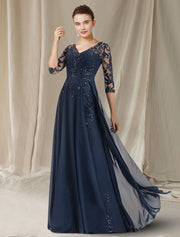 A-Line Mother of the Bride Dress Elegant V Neck Floor Length Chiffon Lace Sequined Half Sleeve with Sequin Appliques