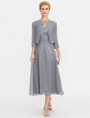 A-Line Mother of the Bride Dress Fall Wedding Guest Dresses Plus Size Elegant Illusion Neck Tea Length Chiffon Corded Lace Sleeveless Wrap Included with Lace Pleats