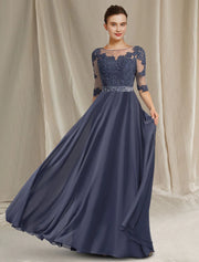 A-Line Mother of the Bride Dress Luxurious Elegant Jewel Neck Floor Length Chiffon Lace Tulle Half Sleeve with Crystals Appliques