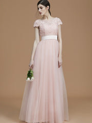 A-Line/Princess Bateau Short Sleeves Floor-Length Sash/Ribbon/Belt Tulle Bridesmaid Dresses