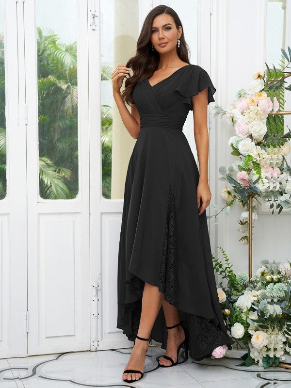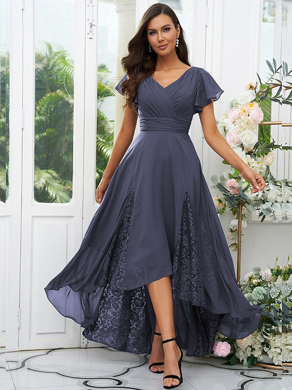 A-Line/Princess Chiffon Lace V-neck Short Sleeves Asymmetrical Bridesmaid Dresses
