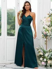 A-Line/Princess Woven Satin Ruched V-neck Sleeveless Floor-Length Bridesmaid Dresses