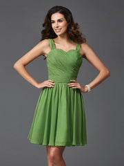 A-Line/Princess Straps Ruffles Sleeveless Short Silk like Satin Bridesmaid Dresses