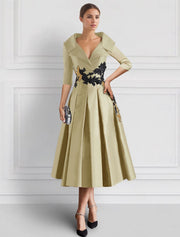 Buyishang Champagne Embroidered A-Line Cocktail Dresses Mother of Bride Elegant Formal Ankle Length 3/4 Length Sleeve Shirt Collar Satin with Appliques