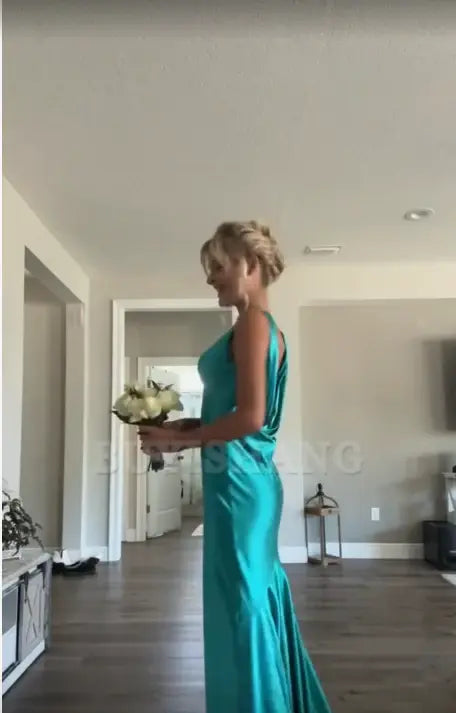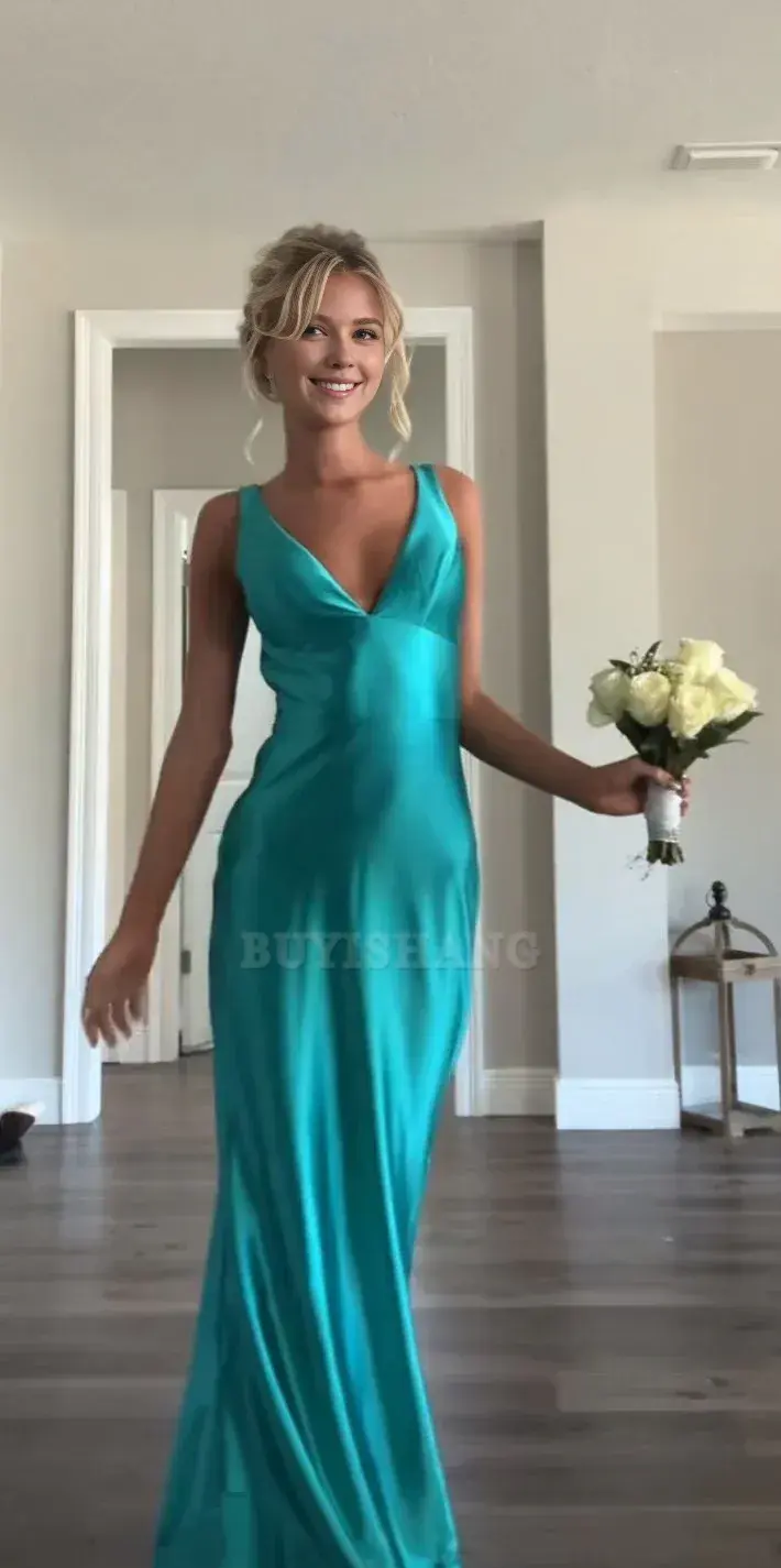 Buyishang Classy A line V Neckline Blue Satin Sleeveless Long Prom Dresses formal wear dresses