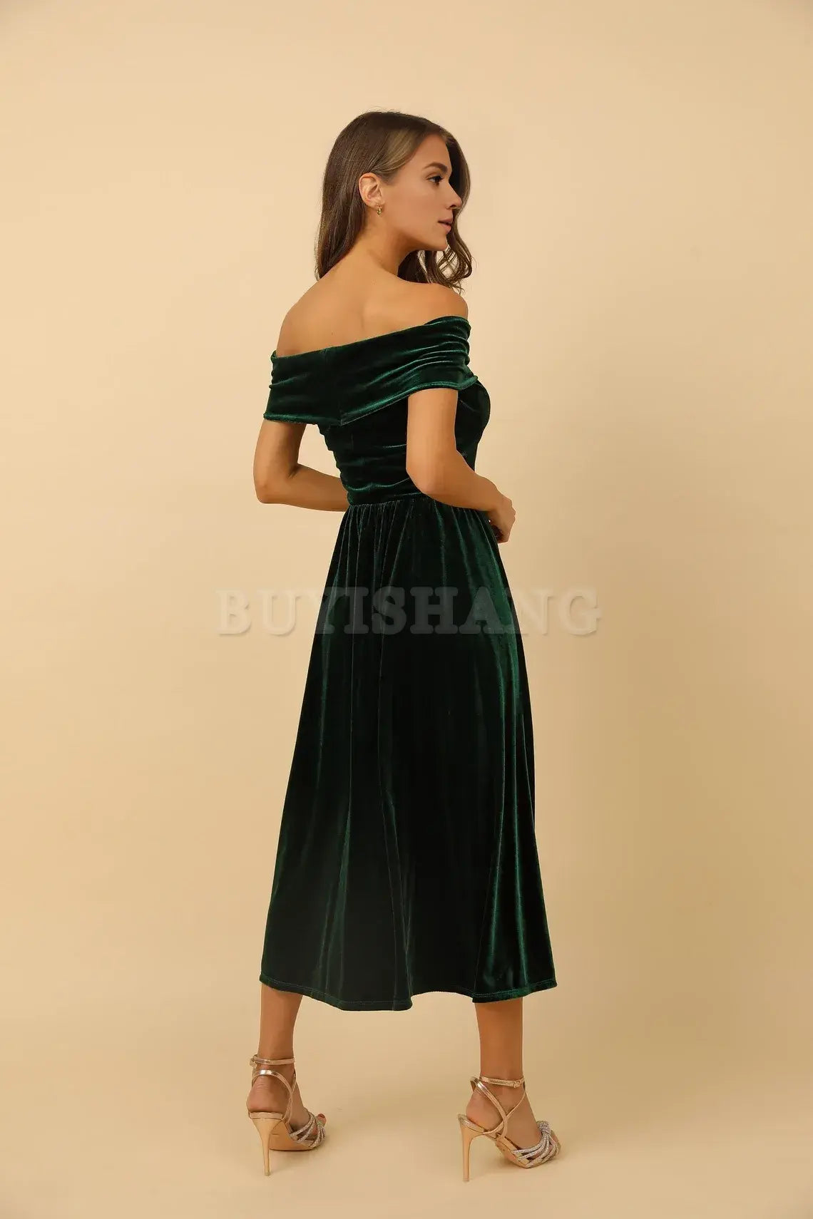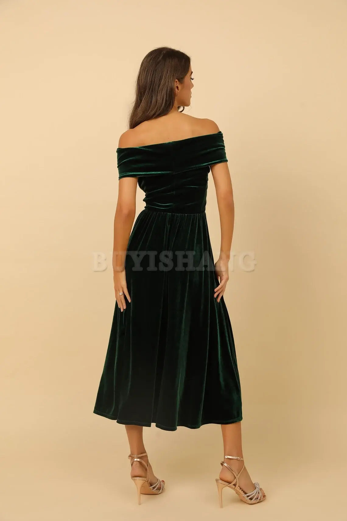 Buyishang Dark green midi dress velvet bridesmaids dress evening off the shoulder velvet dress prom
