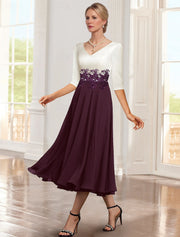 Buyishang Dress Mother of the Bride Dress Wedding Guest Church Elegant V Neck Tea Length Chiffon Satin Cap Sleeve Jacket Dresses with Lace Color Block