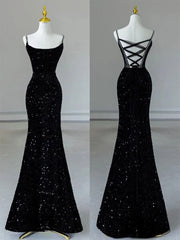 Buyishang Elegant Sexy Mermaid Spaghetti Straps Sequin Black Long Prom Dresses