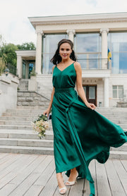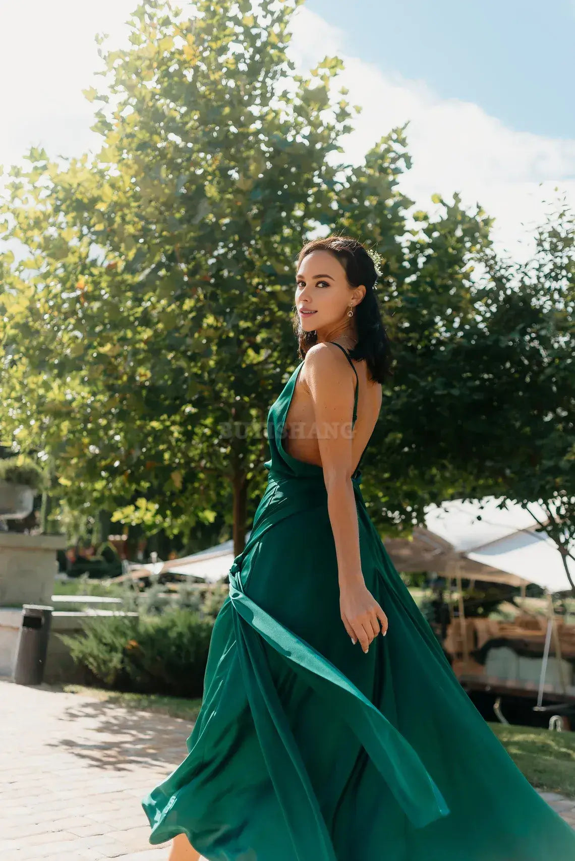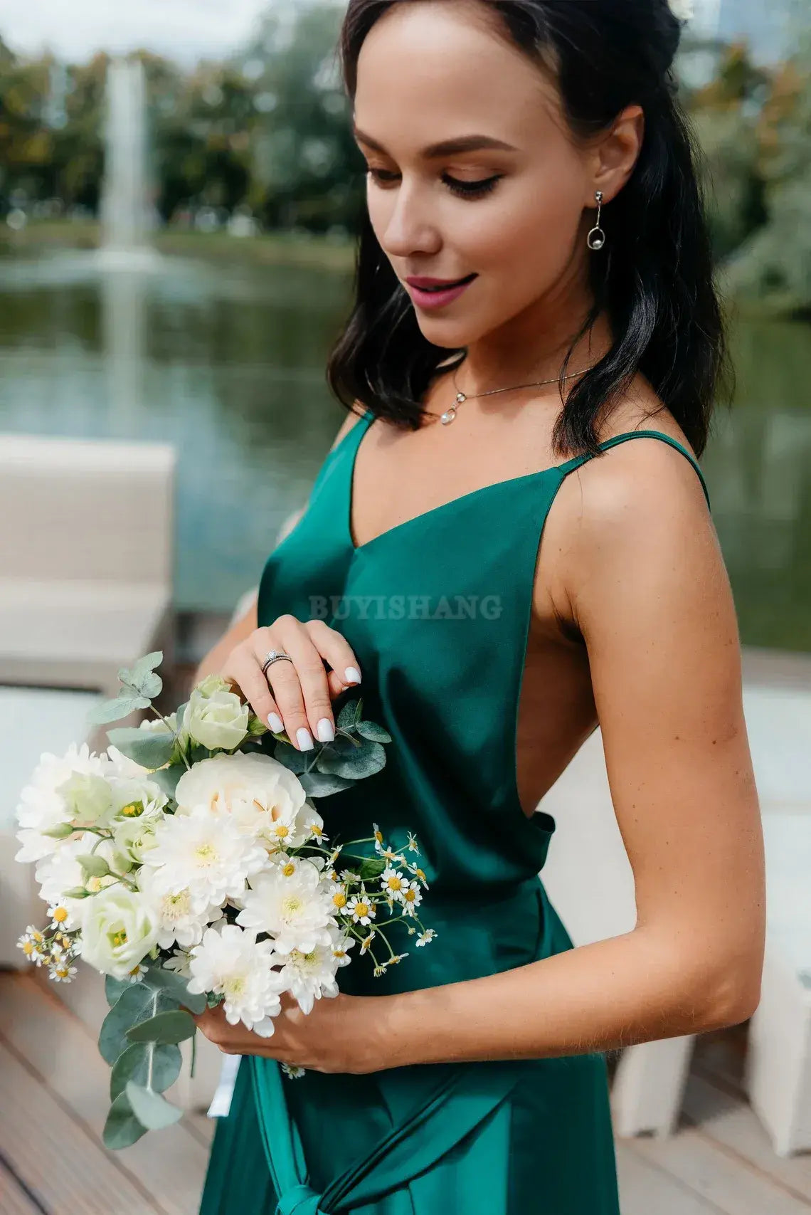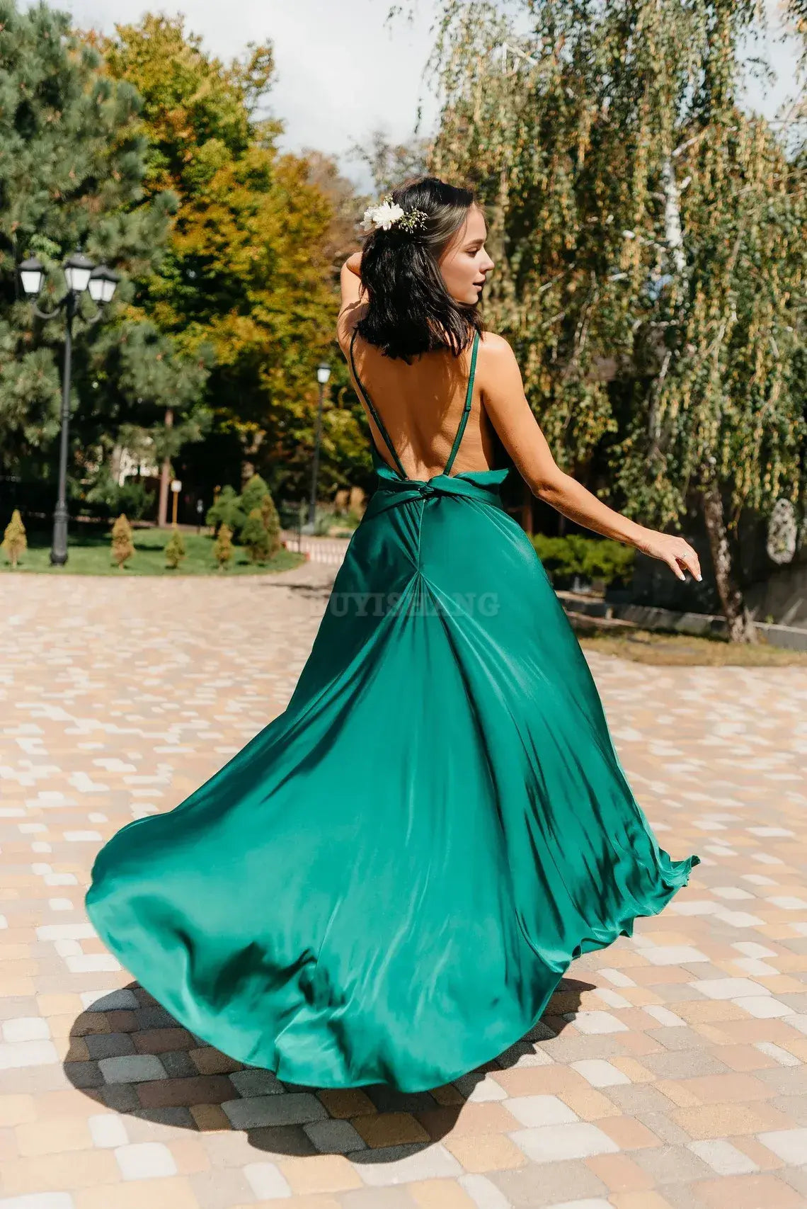Buyishang green wedding dress Long maxi dress with open back Backless green Atlas Dress Prom Dress V neck Bridesmaid Princess Evening Wedding Dress