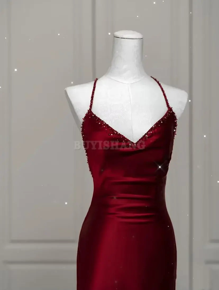 Buyishang Sexy Mermaid Spaghetti Straps Floor Length Burgundy Satin Backless Prom Dresses formal wear dresses - US 2 / UK 6 / EU 32