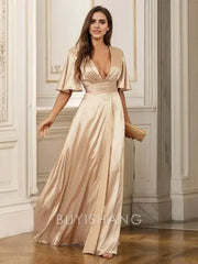 Buyishang Simple A-Line/Princess Silk like Satin Ruched V-neck Short Sleeves Floor-Length Dresses