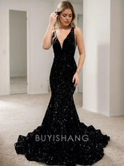Buyishang Simple Mermaid V-neck Sequin Sweep Train Velvet Sequins Dress