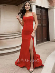 Buyishang Simple Sheath Spaghetti Straps Sweep Train Stretch Crepe Corset Dress