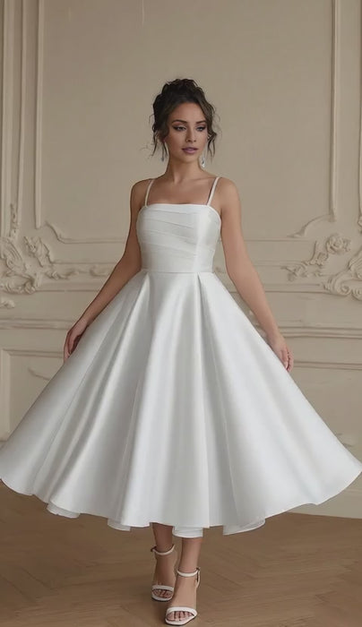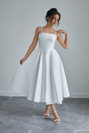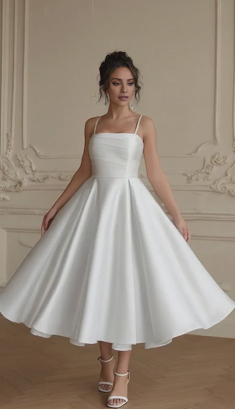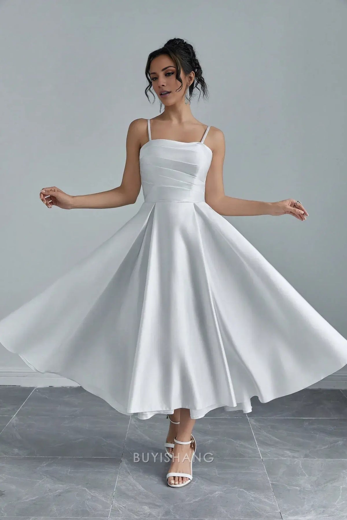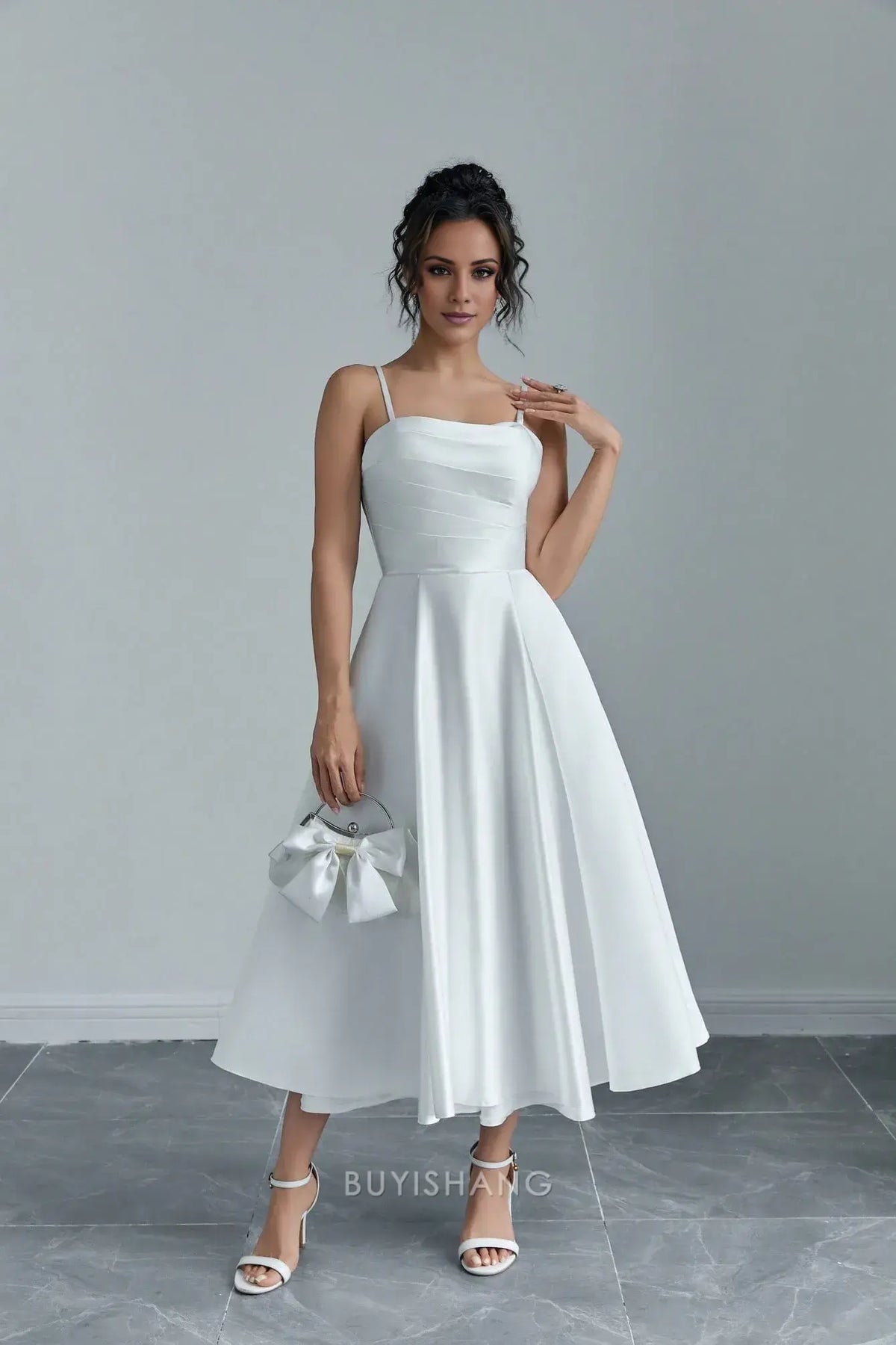 Buyishang's refined A-line prom dress showcases delicate spaghetti straps and a sleeveless design that exudes understated sophistication. The tea-length cut offers a charming, vintage-inspired silhouette ideal for formal occasions. A lace-up back detail provides both structural support and an alluring aesthetic touch. The streamlined construction flatters the figure while allowing comfortable movement. Perfect for prom, cocktail events, or formal celebrations where timeless elegance is paramount.