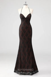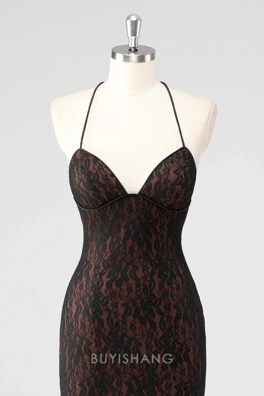 Elegant Black Spaghetti Straps Halter Neck Lace Mermaid Maxi Dress Bac – Buyishang Dresses index