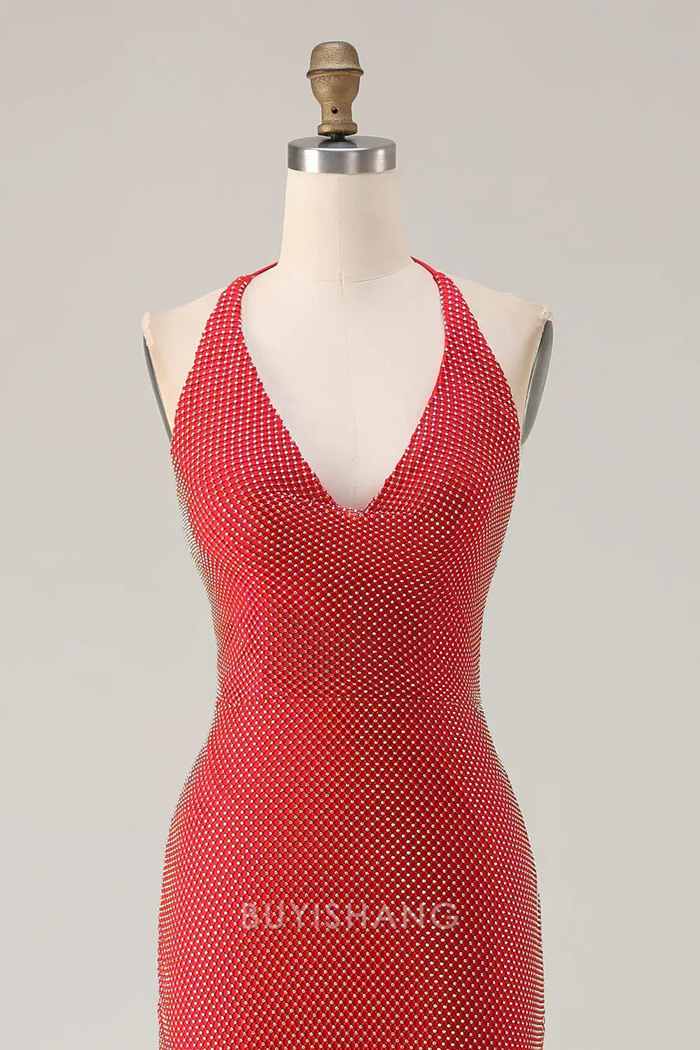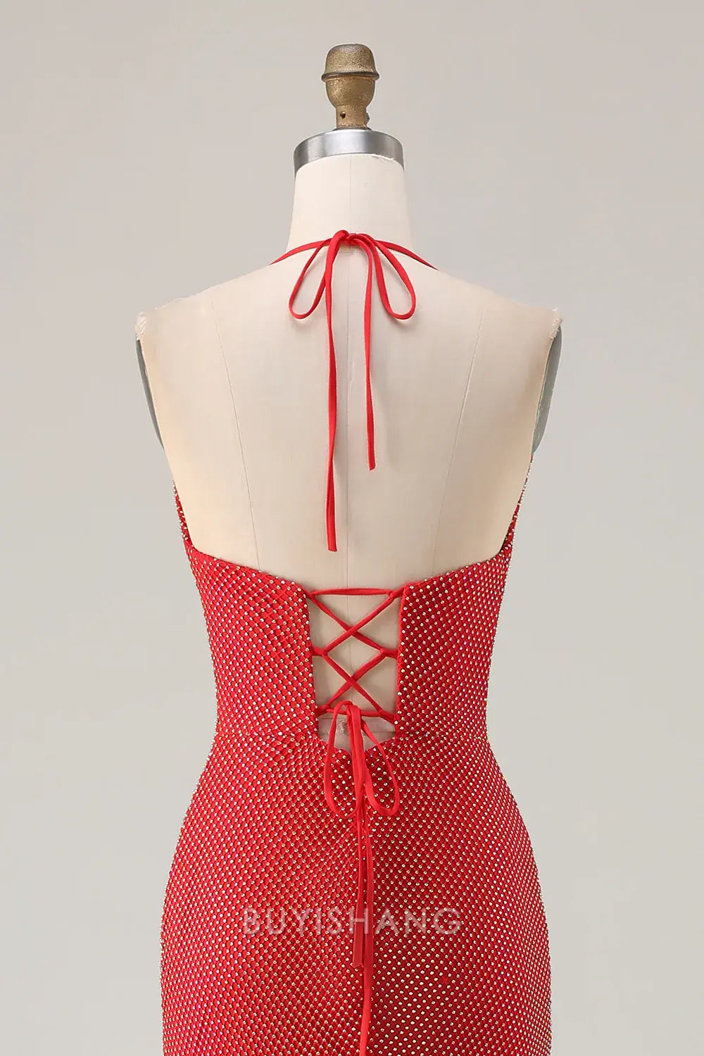 Elegant Halter Neck Crystal-Embellished High Slit Mermaid Maxi Dress Prom Dress