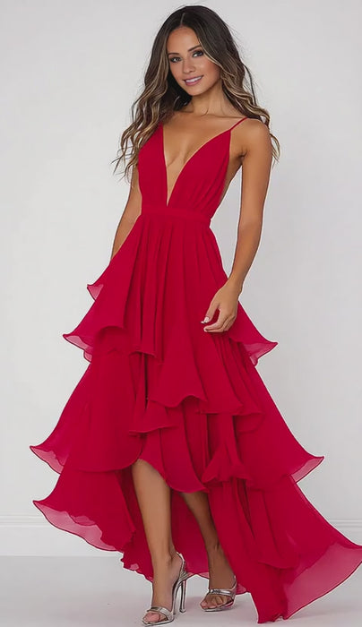 Command attention in Buyishang's striking red chiffon formal gown, expertly designed for the discerning guest. The deep V-neckline creates an alluring focal point while maintaining sophisticated restraint, while flowing chiffon fabric drapes with ethereal grace. Intricate pleating throughout the bodice adds textural interest and refined detail, while the asymmetrical hemline delivers contemporary edge to a classic silhouette. The floor-length cut elongates your frame, and the lightweight chiffon ensures comfortable movement all evening long. Ideal for prom, black-tie events, and formal galas, this dress balances bold color with understated elegance, making it a versatile choice for those seeking timeless glamour with modern sensibility.