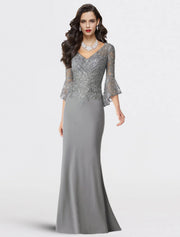 Mermaid / Trumpet Mother of the Bride Dress Plus Size Elegant V Neck Sweep / Brush Train Chiffon Lace 3/4 Length Sleeve with Sequin Appliques - US 2 / UK 6 / EU 32