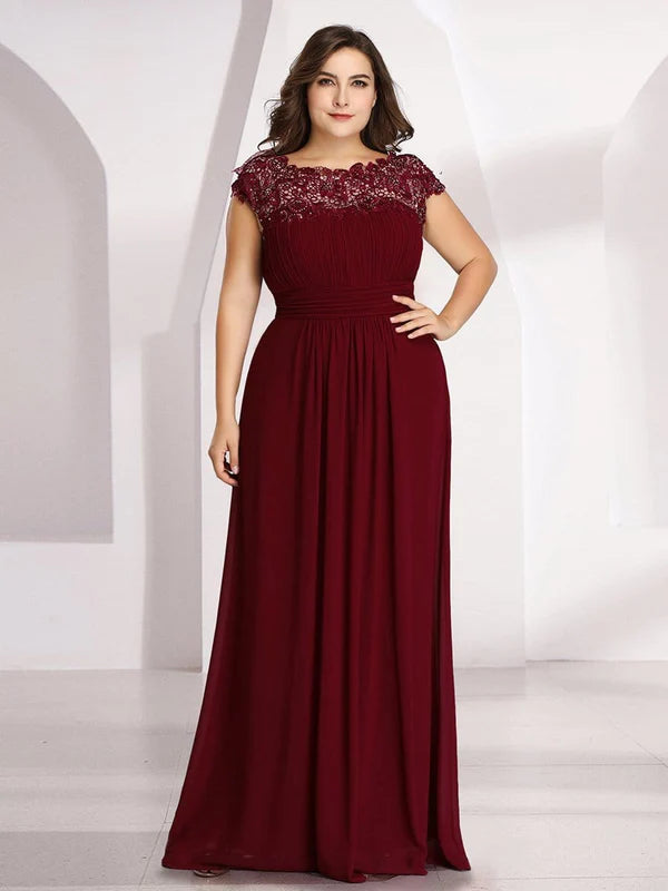 Plus Size Maxi Long Formal Lace Cap Sleeve Evening Dress - Burgundy