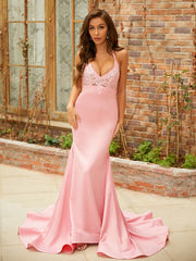 Sheath/Column Charmeuse Applique Halter Sleeveless Sweep/Brush Train Dresses