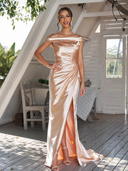 Sheath/Column Woven Satin Ruched Off-The-Shoulder Sleeveless Sweep/Brush Train Bridesmaid Dresses