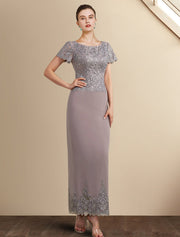 Sheath / Column Mother of the Bride Dress Elegant Jewel Neck Ankle Length Chiffon Lace Short Sleeve with Appliques