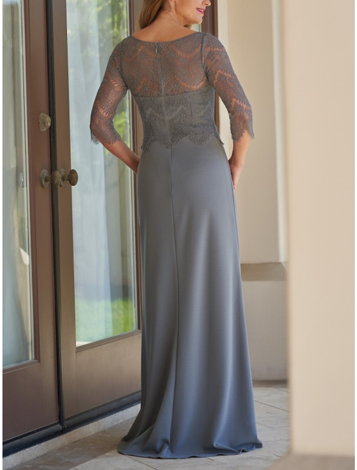 Sheath / Column Mother of the Bride Dress Formal Party Elegant Scoop Neck Sweep / Brush Train Chiffon Half Sleeve with Lace Solid Color