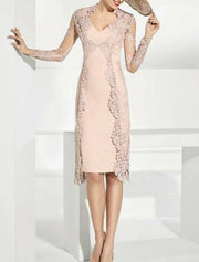 Sheath / Column Mother of the Bride Dress Plunging Neck Knee Length Satin Long Sleeve Jacket Dresses with Lace