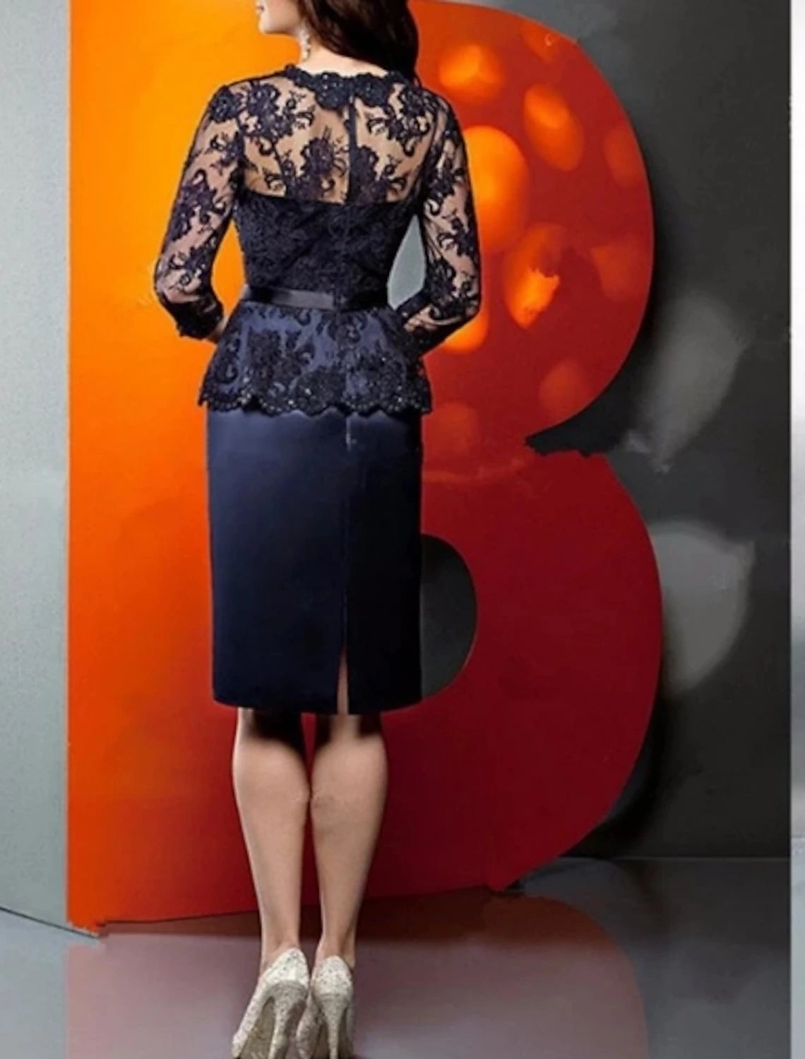 Sheath / Column Mother of the Bride Dress See Through Scalloped Neckline Knee Length Polyester 3/4 Length Sleeve with Lace Sash / Ribbon Split Front - US 2 / UK 6 / EU 32