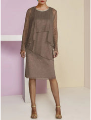 Sheath / Column Mother of the Bride Dress Wedding Guest Elegant Petite Scoop Neck Knee Length Chiffon Long Sleeve with Crystals Ruching
