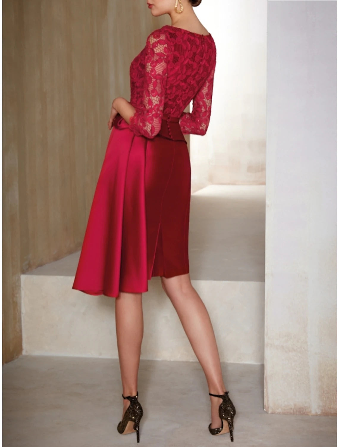 Sheath / Column Mother of the Bride Dress Wedding Guest Party Vintage Elegant Scoop Neck Knee Length Satin Lace Half Sleeve with Bow(s) Pleats - US 2 / UK 6 / EU 32