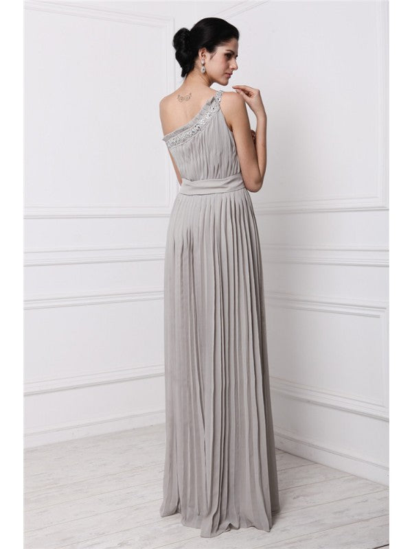Sheath/Column One-Shoulder Sleeveless Beading Pleats Long Chiffon Dresses