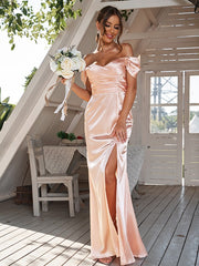 Sheath/Column Silk like Satin Ruched Off-the-Shoulder Sleeveless Floor-Length Bridesmaid Dresses