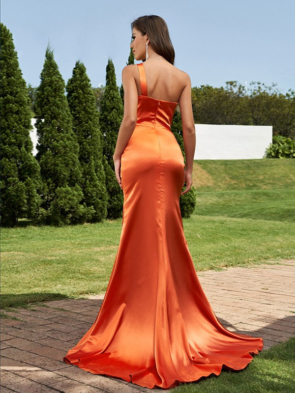 Sheath/Column Silk like Satin Ruched One-Shoulder Sleeveless Sweep/Brush Train Bridesmaid Dresses