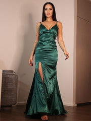Sheath/Column Silk like Satin Ruched V-neck Sleeveless Sweep/Brush Train Dresses - US 2 / UK 6 / EU 32