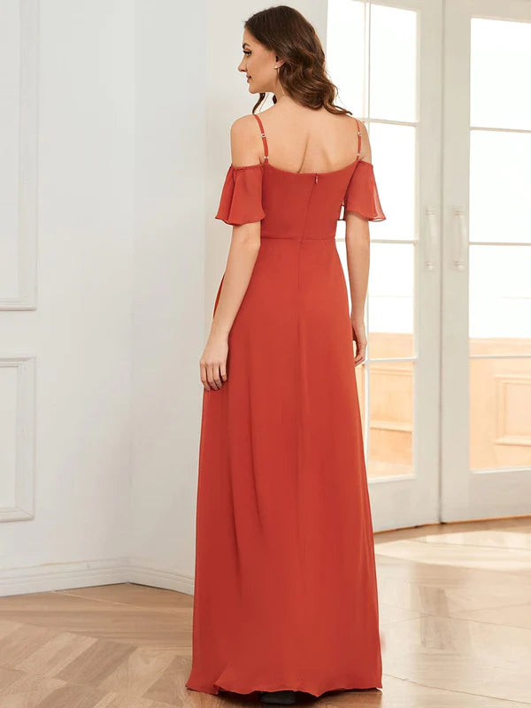 Stylish Cold Shoulder Flare Sleeves Flowy Bridesmaid Dress - Burnt Orange