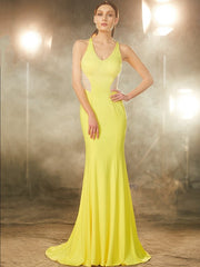 Trumpet/Mermaid V-neck Sleeveless Sweep/Brush Train Beading Spandex Dresses