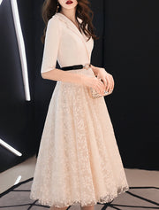 A-Line Cocktail Dresses Minimalist Dress Party Wear Cocktail Party Tea Length Half Sleeve V Neck Lace with Sash / Ribbon Pleats - US 2 / UK 6 / EU 32