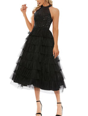 A-Line Cocktail Dresses Sparkle & Shine Dress Wedding Guest Semi Formal Tea Length Sleeveless High Neck Tulle with Sequin - US 2 / UK 6 / EU 32