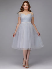 A-Line Elegant Dress Wedding Guest Cocktail Party Tea Length Short Sleeve Off Shoulder Tulle with Sash / Ribbon Criss Cross