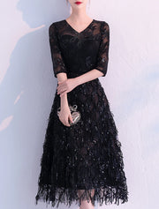A-Line Flapper Sparkle Party Wear Cocktail Party Dress V Neck Half Sleeve Tea Length Lace with Sequin Tassel