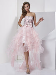 A-Line/Princess Strapless Sleeveless Beading High Low Organza Homecoming Dresses