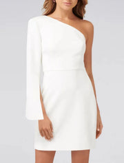 Sheath / Column Minimalist White Wedding Guest Cocktail Party Birthday Dress One Shoulder Long Sleeve Short / Mini Satin with Draping - US 2 / UK 6 / EU 32