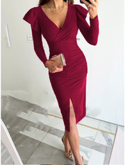 Women's Red Christmas Party Dress Cocktail Dress Wedding Guest Dress Midi Dress Black Pink Wine Long Sleeve Pure Color Ruffle Spring Fall Winter V Neck Winter Dress - Wine / US 2 / UK 6 / EU 32