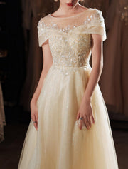 A-Line Beautiful Back Elegant Prom Formal Evening Dress Jewel Neck Short Sleeve Floor Length Lace with Beading Appliques
