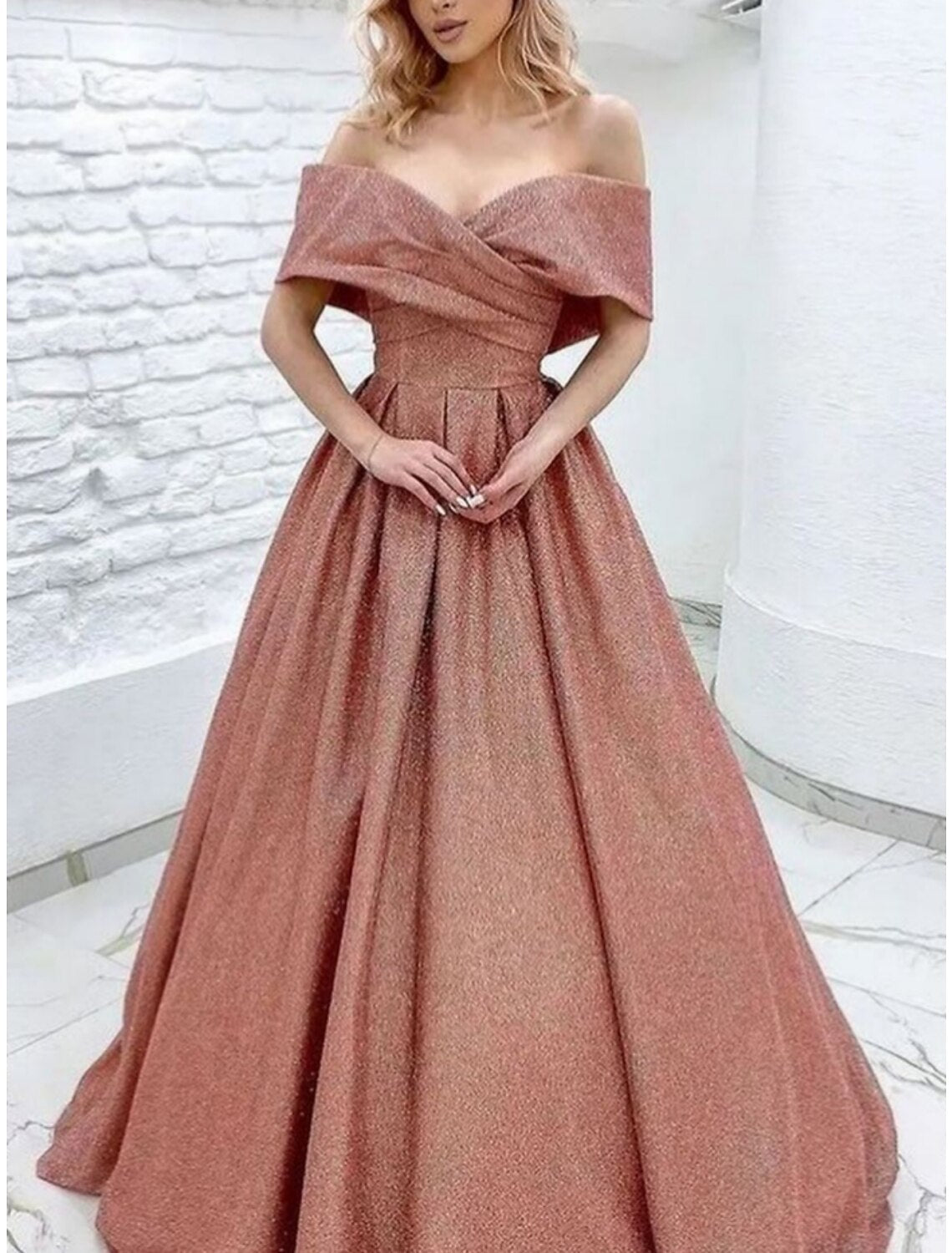 A-Line Evening Gown Elegant Dress Formal Court Train Short Sleeve Off Shoulder Sequined with Glitter Pleats Ruched - US 2 / UK 6 / EU 32